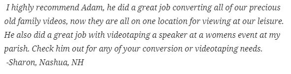I convert all of the following tapes – VHS, VHS-C, hi-8, miniDV, Sony DVR minidisk, cassette tapes, RECORDS, to DVD and digital – $10 apiece**. I also convert reels, slides and pictures of all kinds. 3” reels are $10 apiece, 5” reels are $20 apiece, 7” reels are $40 apiece.